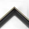 This stair step wood floater frame has a matte black finish with a steep upper and small lower step. The canvas will hover neatly within the simple, modern border.
