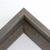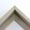 This stair step wood floater frame with a high shine lets your canvas hover neatly within the simple, modern border. The frame features a brushed silver finish with a steep upper and small lower step. The iridescent color varies slightly in different light, running from warm, muted gold to cool, opaque silver.