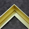 This stair step wood floater frame has a high shine, brushed gold finish with a steep upper and small lower step. The canvas will hover neatly within the simple, modern border.