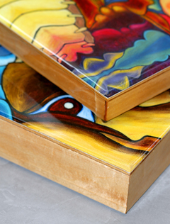 Once boards are prepped, it can be used to create art. Here is an example of dry mounting on wood panel w/ resin coating.