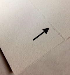 By scoring the paper along a straightedge, creasing, and gently tearing it, a deckle edge can be easily achieved. |
