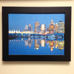 A plain and simple, black frame highlights the blues of this skyline canvas print