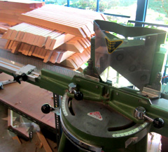 The length of wood is generally 8 to 12 feet long. Depending on the order, the wood may be 3/4" thick, or 1-3/8" thick. The length is slid under the cutter and the double blade is lowered using a foot pedal. The blade cuts the wood into two pieces, each with a 45° angle, and wastes only the small, triangular piece. A single length of wood can usually be cut into two or more frames (4 pieces each).